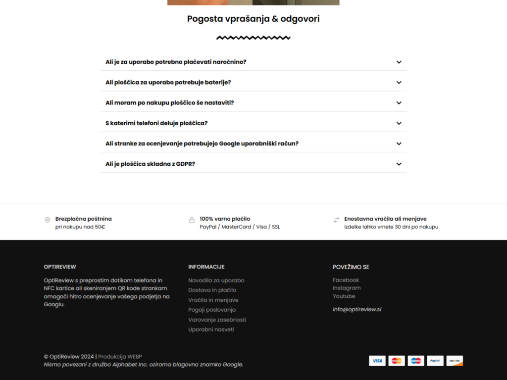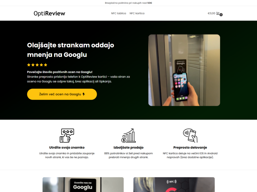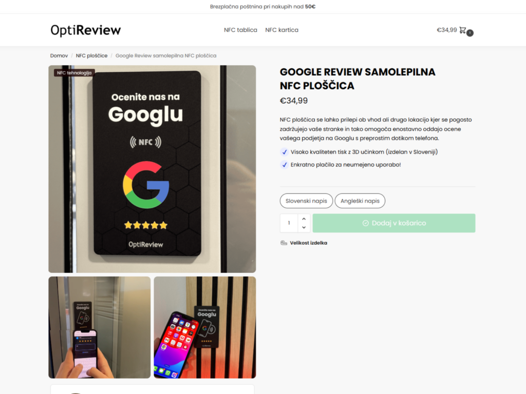 Osrednji del spletne strani predstavlja spletna trgovina z NFC in QR produkti, ki podjetjem omogočajo, da svoje stranke z enim dotikom ali skeniranjem QR kode usmerijo neposredno na stran za oddajo mnenja.